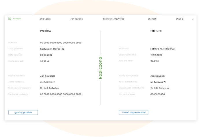 Transferlink will retrieve a list of transfers from your bank and then link them to orders or invoices from Własna integracja. Automatically. You don't have to waste any time on it.